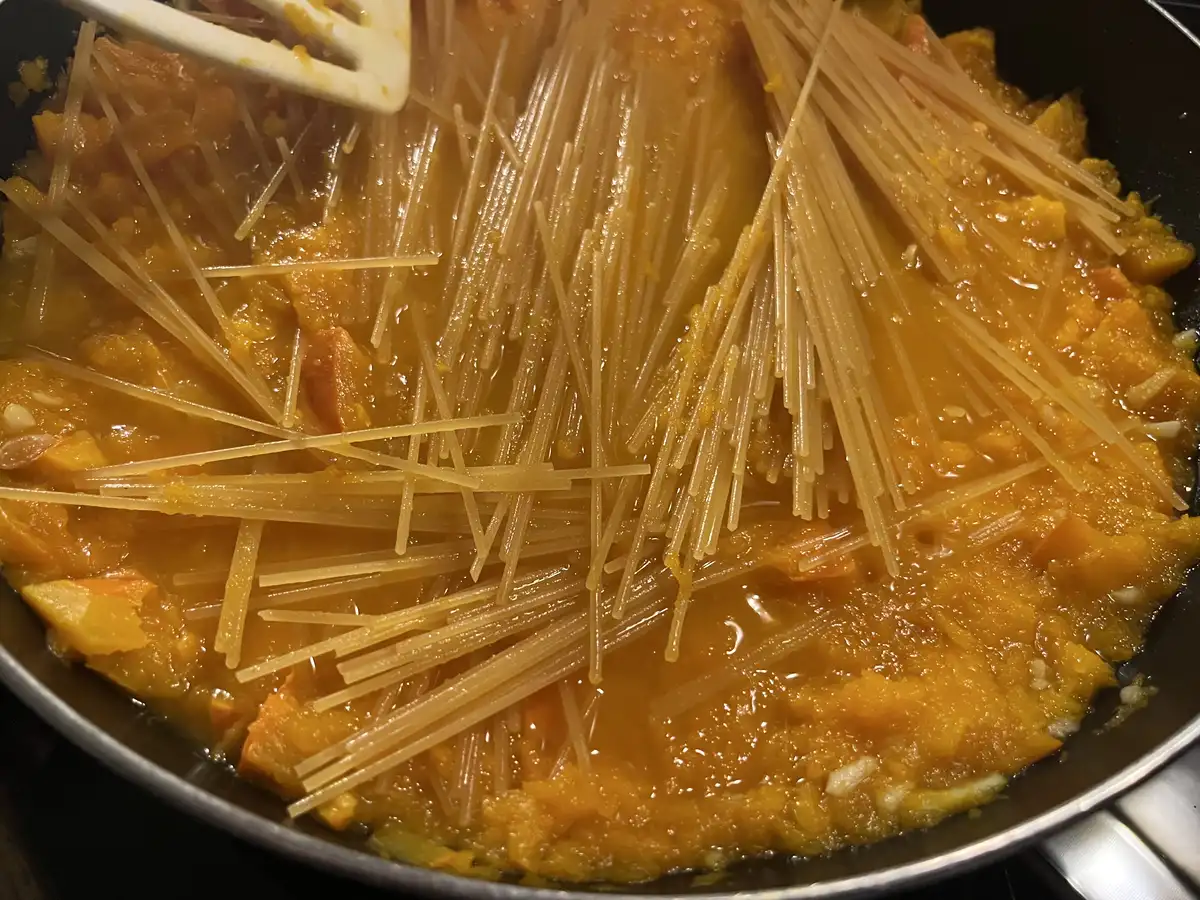 Hokkaido in mittlere Stücke schneiden, mit Knoblauch und Peperoni in Olivenöl leicht anbraten, Glas Wasser dazu, Deckel drauf und bei mittlerer Flamme ca. 10 Minuten garen, ab und an umrühren, Peperoni rausnehmen, Wasser dazu bis der Kürbis grade so bedeckt ist, Salz dazu, umrühren und wieder abgedeckt bei mittlerer Hitze erneut 10 Minuten köcheln, Spaghetti 2 bis 3x brechen oder andere Pasta, die sich mit dem Kürbis gut vermischt, direkt in die Pfanne geben und ohne Deckel die Pasta al dente und bis sie sich gut mit dem Kürbis verbunden hat köcheln. Eventuell je nach Konsistenz etwas Wasser beirühren. Pastateller vorwärmen und schnell noch Petersilie zum Bestreuen grob hacken.